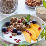 I love this granola because it’s super easy to prepare, it doesn’t require baking and it’s made of only wholesome ingredients. It goes well with yogurt because the sweetness of the granola and the sharpness of the yogurt complement each other so well.